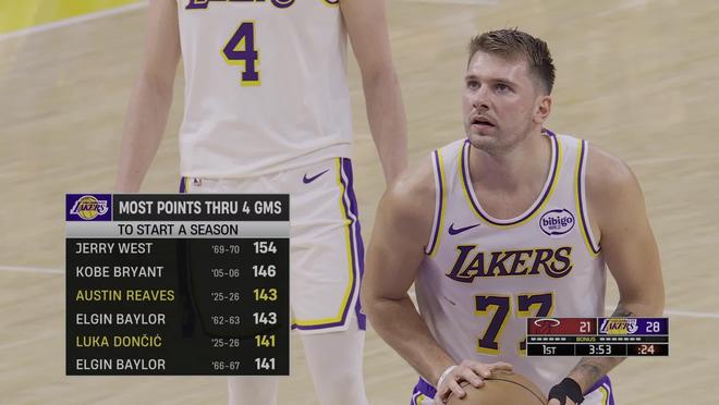 在本场比赛直播期间,转播方给出了一组数据:在本赛季出战的前四场常规赛中,里夫斯和东契奇分别得到了143分和141分,这在湖人队史上能够分别排在第三位和第五位。但当时比赛只进行了不到一节的时间,本场比赛结束后,东契奇前四场的得分来到了165分,成为湖人队史前四场比赛得分最多的球员。