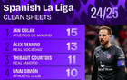 本赛季西甲零封榜:奥布拉克15次居首,库尔图瓦11次第3&3C8次第7